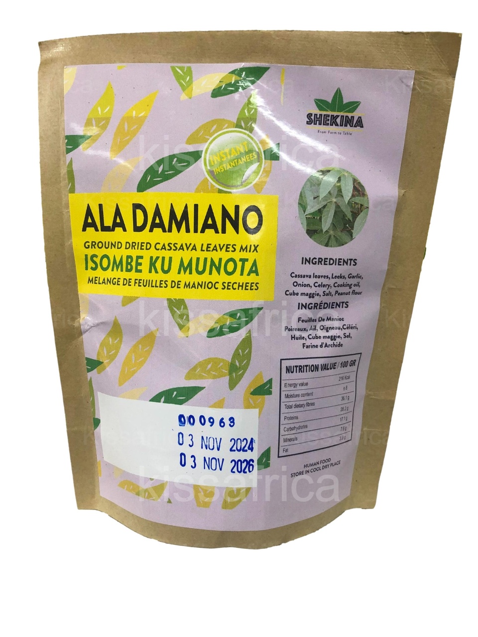 Le Mélange Isombe Ku Munota est préparé à partir de feuilles soigneusement lavées, broyées et séchées. Il suffit de les réhydrater pour retrouver leur texture naturelle. Vous pouvez ensuite les cuire dans une sauce, les associer à du poisson, ou encore les enrichir avec de la pâte d’arachide.